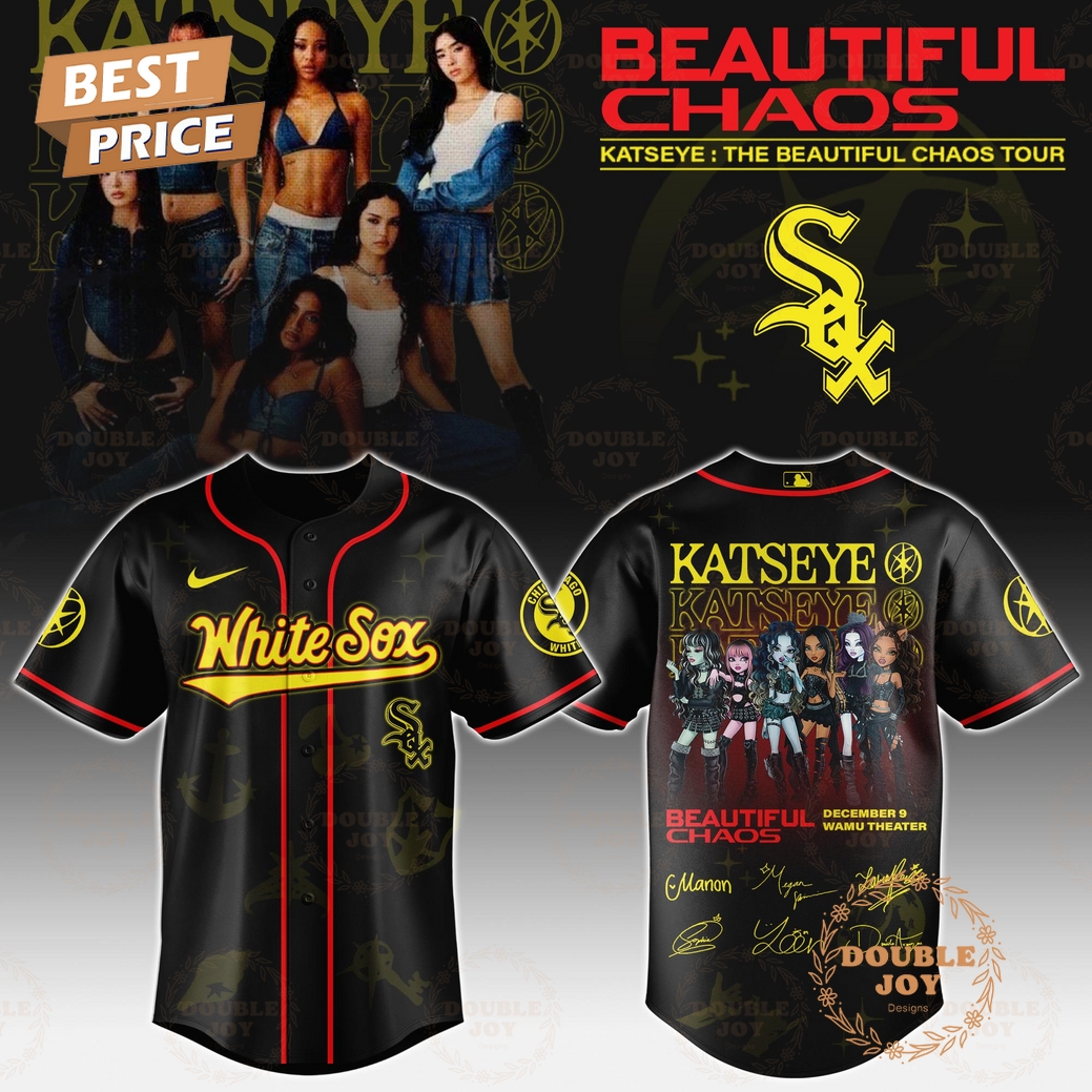 Visually, the jersey is a symphony of controlled contrasts. It predominantly features the timeless black and white color palette synonymous with the Chicago White Sox, providing a classic, authoritative base. However, this traditional canvas is expertly disrupted and enhanced by elements inspired by Katseye’s “The Beautiful Chaos Tour.” The traditional “Sox” script across the chest is rendered in a slightly deconstructed, yet utterly legible, contemporary font, giving a subtle nod to the “chaos” theme without sacrificing the team’s identity. This is beautifully complemented by intricate, tone-on-tone sublimated patterns of shattered geometric lines and dynamic energy bursts, subtly woven into the black fabric of the sleeves and shoulder panels. These patterns, only truly revealed in certain lighting, symbolize the ‘chaos’ of the tour, while their refined execution speaks to the ‘beautiful’ aspect. The Katseye logo, intricately embroidered in an iridescent silver thread that shifts between subtle greys and vibrant blues under different light, is elegantly positioned on the right sleeve, providing a sophisticated co-branding element that respects both entities. On the back, above the optional player number, “THE BEAUTIFUL CHAOS TOUR 2025” is emblazoned in a sleek, futuristic typeface, ensuring its commemorative significance is clear.