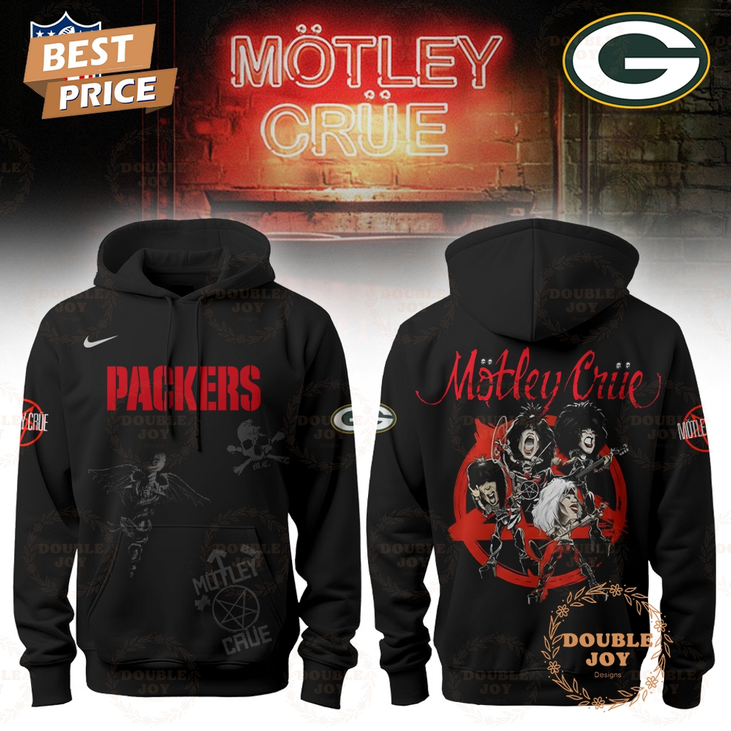 Visually, the hoodie stands as a masterclass in brand integration, showcasing an imaginative and cohesive design that harmoniously blends the iconic aesthetics of both the Green Bay Packers and Mötley Crüe. The front panel features a strikingly reinterpreted Packers “G” logo, subtly infused with Mötley Crüe’s rebellious edge, perhaps through a distressed texture or an embedded rock-and-roll motif like a stylized guitar pick or a hint of a skull within its familiar curves, rendered in a striking combination of classic Packers green and gold, accented with Mötley Crüe’s signature black, red, and silver. This central graphic is applied using a high-definition screen-printing technique that guarantees vivid color saturation and exceptional detail, resisting cracking and fading over time. The back of the hoodie serves as an even grander canvas for this extraordinary collaboration, proudly displaying the “Mötley Crüe Tour 2026” text in a bold, instantly recognizable font, often framed by a powerful composite graphic that might depict a cheesehead-wearing skull or a roaring amplifier adorned with the Packers ‘G’, further solidifying the shared identity. Below this, a thoughtfully arranged list of fictional tour cities and dates lends an air of authenticity and exclusivity, making the hoodie feel like a genuine piece of event merchandise from a historic, albeit imagined, crossover tour. The sleeve designs, subtly complementing the main graphics, might feature alternating team and band insignias or custom stripes, adding another layer of visual interest.