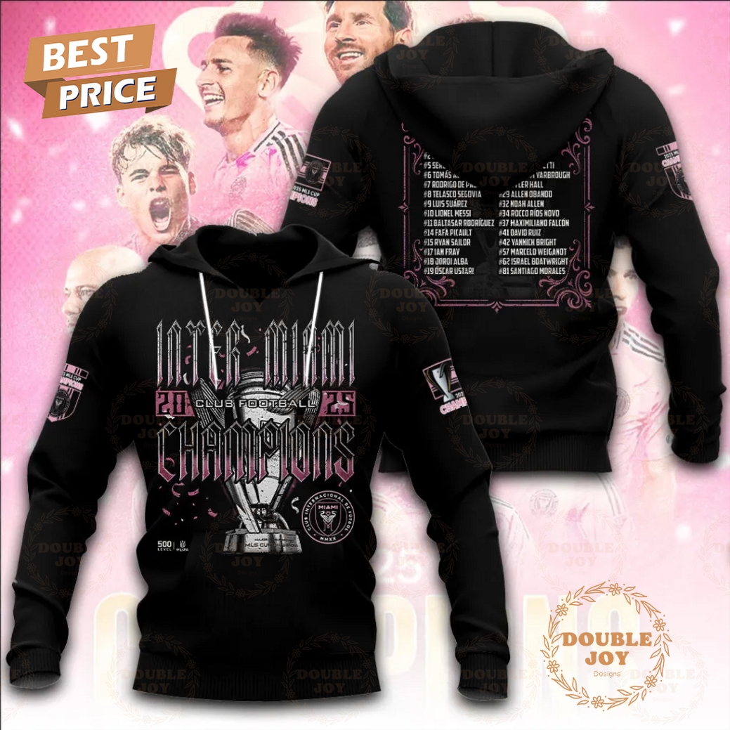 The visual impact of these items is immediate and striking. Dominating the design is the proud declaration “Inter Miami CF 2025 Champions,” rendered in high-definition print quality that stands up to repeated wear and washing without fading, cracking, or peeling. This central text is often complemented by the iconic Inter Miami CF crest, rendered with vibrant, true-to-team colors – often the signature pink, black, and white – that are instantly recognizable. The graphics are sharp, precise, and strategically placed for maximum visibility, transforming the garment into an instant conversation starter. The choice of base colors for the T-shirt and Hoodie typically includes classic black, elegant white, or various shades of gray, all serving as perfect canvases to make the championship declaration pop. The hoodie further features practical elements like a double-lined hood for added warmth and structure, an adjustable drawstring with quality metal eyelets, and durable ribbed cuffs and hem that provide a snug fit and prevent cold air from entering.