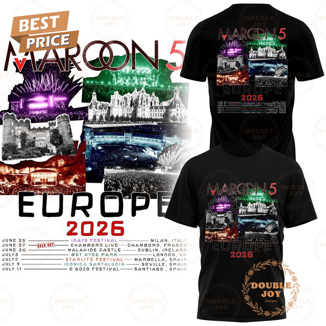 This essential piece of merchandise, celebrating the highly anticipated Maroon 5 Europe Tour 2026, presents itself as both a classic black t-shirt and a comfortable hoodie, each meticulously designed to capture the spirit of the event while providing lasting quality and style for dedicated fans. The core of this collection is its striking graphic print, centrally featured on the front, which masterfully blends the iconic Maroon 5 logo with intricate tour-specific detailing. Expect a visually dynamic arrangement that likely incorporates the tour name, “Europe Tour 2026,” alongside stylized elements that evoke a sense of journey and the band’s signature musical aesthetic. The print itself is applied using a high-quality screen-printing technique, ensuring vibrant colors – often a contrasting palette of white, silver, or perhaps a subtle red, standing out boldly against the deep black fabric – and remarkable durability that resists cracking or fading even after numerous washes, thereby preserving the design’s integrity for years to come.