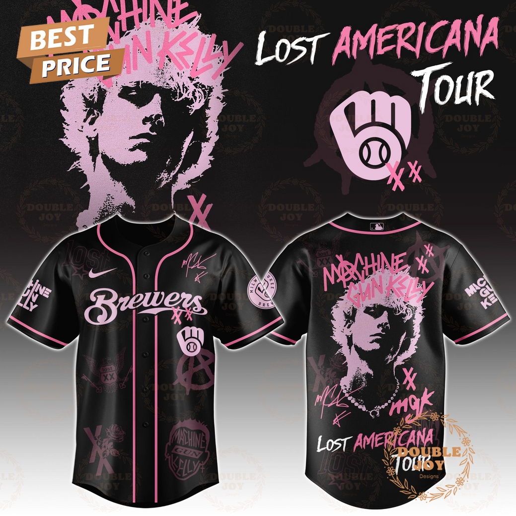 The Milwaukee Brewers x MGK Tour 2025 The Lost Americana Baseball Jersey represents a truly distinctive fusion of professional sports and contemporary music culture, offering an unparalleled piece of fan apparel. This isn’t just another team jersey or concert tee; it’s a carefully curated collector’s item that bridges two passionate fan bases with a unique aesthetic. At its core, the jersey’s design masterfully blends the iconic Milwaukee Brewers identity with the raw, rebellious spirit of Machine Gun Kelly, all filtered through the evocative “Lost Americana” theme. This theme manifests in a subtly distressed finish that gives the jersey an immediate vintage appeal, as if it has been on countless journeys and witnessed unforgettable moments. Expect a rich, nuanced color palette, likely incorporating classic Brewers blues and golds, but with desaturated tones or unexpected accents that align with MGK’s punk-rock edge—think faded creams, deep oxblood reds, or even a dominant charcoal or black, providing a striking contrast to traditional sports merchandise.