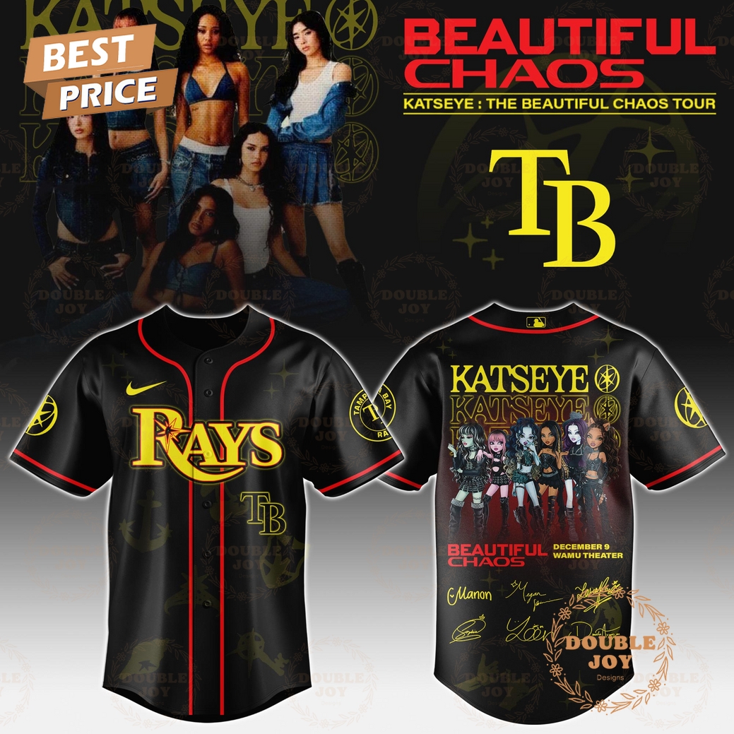 The front of the jersey proudly displays the “Rays” name in its authentic, bold typography, but with an innovative twist: the letters themselves are subtly infused with a shimmering, almost digital texture that hints at Katseye’s modern, dynamic appeal. Below this, a tastefully integrated, smaller “Tampa Bay Rays x Katseye” collaboration mark signifies the unique partnership, lending an air of exclusivity. On one sleeve, a specially designed “Beautiful Chaos Tour 2025” emblem, a fusion of baseball and musical iconography, is intricately heat-sealed, serving as a constant reminder of this historic cross-cultural event. Turning to the back, the design explodes with Katseye’s presence, featuring a large, stylized rendition of the group’s logo rendered in a dynamic, almost abstract art style that perfectly captures the “chaos” element of the tour. Beneath this central graphic, a curated list of fictional, yet aspirational, “Tour Stops” from 2025 is subtly woven into the fabric, providing a narrative depth and a collector’s touch that fans of both entities will deeply appreciate.